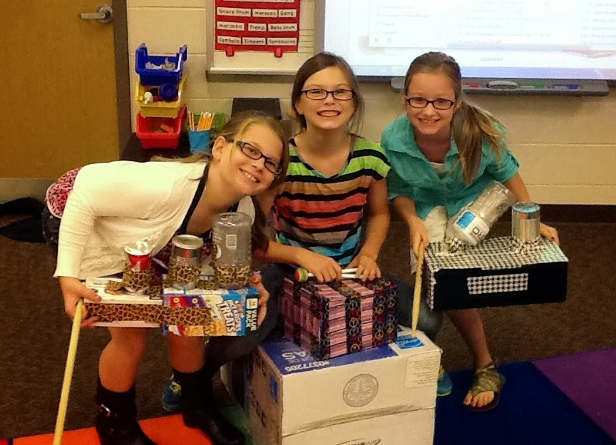 My 4th and 5th grade classes have culminated their rhythm review unit by composing and performing a project inspired by the percussion group, Stomp. I use this project as a way for the students to practice layering contrasting rhythm patterns. The students really enjoy this activity and look forward to it each year. Because I've done it for several years in a row, I've accumulated some really great "trash percussion" instruments. Here are a few of my favorites: